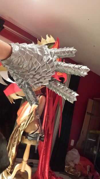Las escalas se basan en la tapa de botella de vino de escala de dragón en Instructables. Sólo corte 7/8 a través de la cinta para que permanecía atado a lo largo de una franja de 1/4" a lo largo de la cinta del conducto. La mano está hecha de espuma de EVA. Los dedos son insultion del tubo pequeño. Todo se envuelve en las escalas.