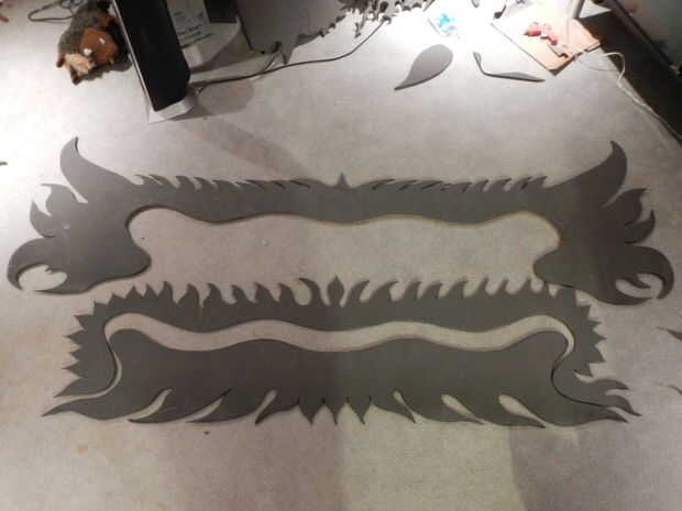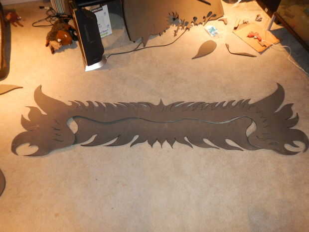 Para dar fuerza quería mantener la espuma en tan grande de secciones como sea posible. Utiliza espuma gris/negro EVA y yo altamente recomendar comprar el blanco en su lugar (mismo precio) o 10 dólares más el gasto y obtener rojo. Hará la pintura mucho más fácil. Use cemento de contacto para unir toda la espuma posible. Siga las instrucciones y deje que se cure/seco durante 10-15 minutos antes de unirse a. Fleje de metal se debe pegar a lo largo de la parte posterior de todas las piezas para permitir el ajuste y configuración (ver fotos más adelante).