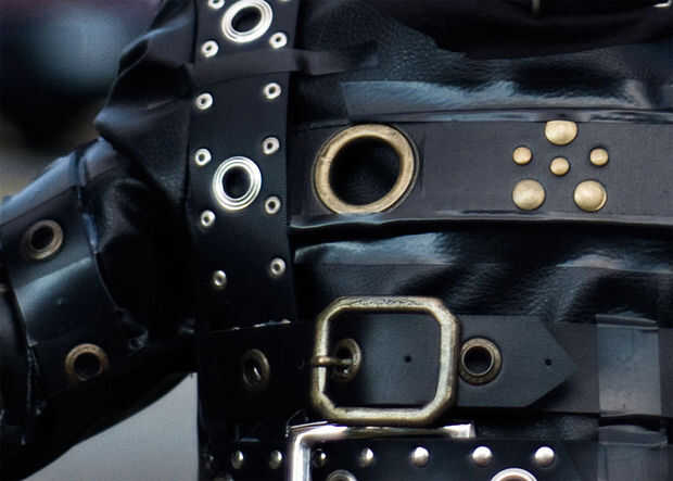 Recoger cinturones de tiendas de ropa usada. Terminamos con diez correas para nuestro hijo entonces 4 años. Obviamente, cuerpos más grandes necesitarán más correas. Fueron recogidos en un período de varios meses cada vez que estábamos cerca de un ejército de salvación. Encontrar cinturones negros de todos los tamaños y con un montón de arandelas, pernos, grandes hebillas de metal, etc.. La variedad más visual las correas tienen, el traje parecerá más interesante.
