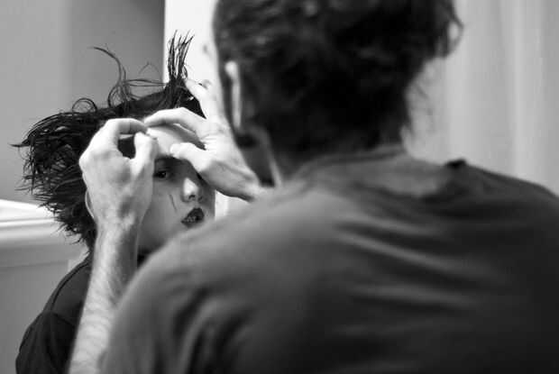 Para el maquillaje, comience con un semi-artificial color blanco para la base y luego añadir algunas sombras bajo los ojos y en los pómulos (esto es Johnny Depp que estamos replicando aquí) con sombra de ojos color carbón. Añadir cicatrices en varios lugares, con líneas de lápiz labial rojo manchado, borradas hasta que suavicen y sutil.