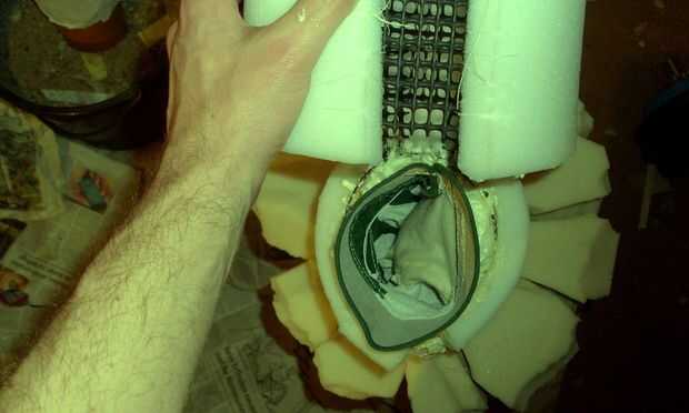 Los brazos no están conectados directamente con el resto del traje. Por lo tanto era necesario hacer algo así como un agarre para handeling los brazos. Decidí usar guantes que se pegan a la parte interior del antebrazo con la espuma de la PU. Ahora puedo poner mis dedos en los guantes para controlar y mover los brazos.
