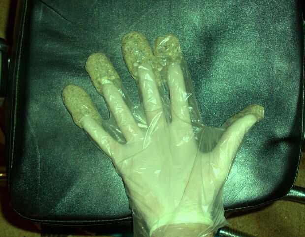 Espuma de la PU se expande mucho por lo que se comprimen los guantes de trabajo y usted no será capaz de poner sus dedos en él, después de curada la espuma de la PU. Para ello utiliza unos guantes de plástico finos, les ponen en los guantes de trabajo y llenos de arena para garantizar que los guantes mantengan su forma. Después de curada la espuma de la PU, guantes de plástico y arena fueron quitados.