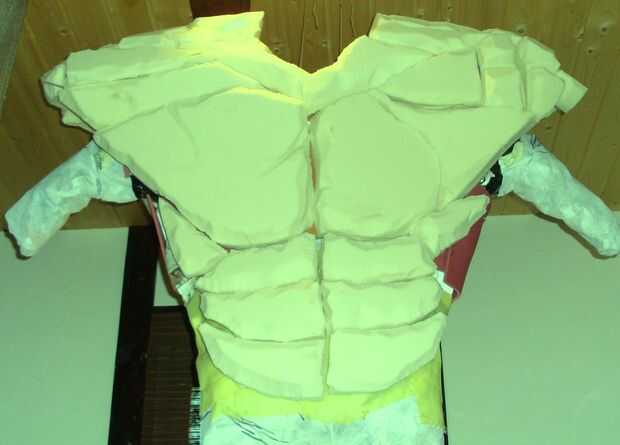 Después que tenía la forma básica comencé conectando la espuma con el traje. Antes de que podía hacerlo pedí espuma y pegamento de espuma. Como espuma me elegido placas con un