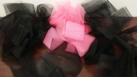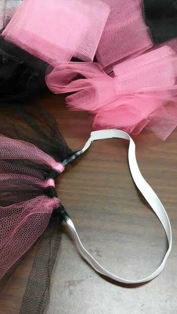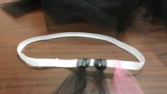 Medir el elástico para ajustar la cintura. Cortar y coser los extremos con hilo y aguja. Doble la malla y córtela en tiras de aproximadamente 3" de ancho. Doblar cada tira por la mitad y coloque el extremo doblado sobre el elástico, tire el resto de la tira a través del lazo y tire suavemente para apretar. Desde que tuve 3 yardas de malla negra y 2 yardas de red rosa que puse 2 negro tiras entonces 1 rosa, 2 negro, 1 color de rosa y mantuvieron repitiendo hasta que la red fue utilizada.