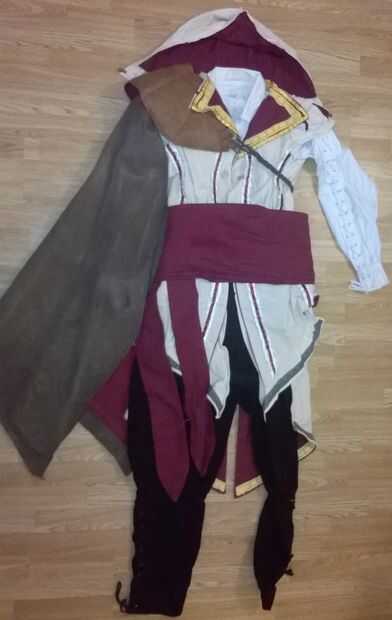 mi Assassins creed traje fue hecha usando:cuero: cabo, chicharronesgamuza: bolsas, chalecoacero inoxidable: chaleco, cestus de metal, Cuchillos arrojadizosFundición de aluminio: cinturón de hebilla, gauntlet y cabo clipsseda: túnicas y faja cinturónr
