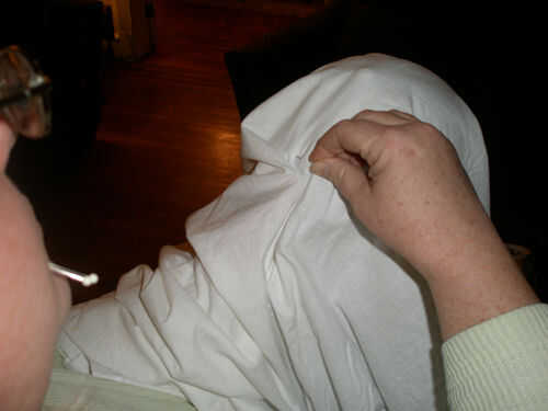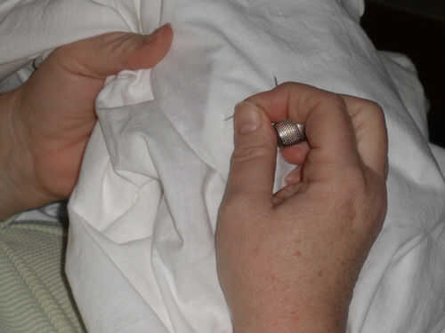 Una vez que se cubrió tomamos de uno joven y mano-se cosen la hoja de la PAC en los cuatro puntos. Evitamos el trabajo extra de costura todo la manera en que parecía excesiva y podrían han hecho demasiado evidente que estaba cosido.
