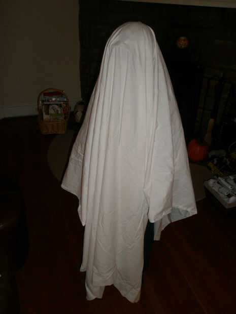 Puesto que era una hoja rectangular la longitud fue cubierta encima de él de adelante hacia atrás. La hoja era apenas grande bastante donde él podría levantar sus brazos y que salen de los lados. Esto nos impidió tener que cortar ranuras en la hoja de las manos volver a salir. Las aberturas están bien pero algunos extra trabajo de coser habría sido necesario para evitar que eventualmente Ripeo y convertirse en orificios mucho más grandes. Con truco más pequeños o los envenenares de las hojas más grandes aberturas brazo probablemente sería necesarias.