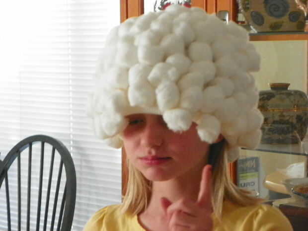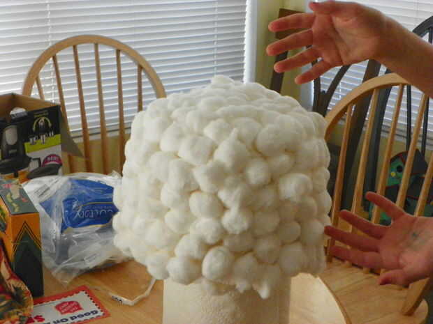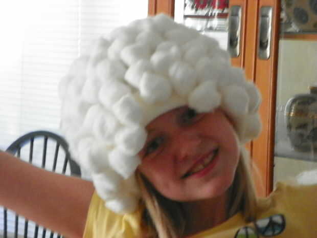 Tomó un sombrero de punto blanco, cinta adhesiva y bolas de algodón pegados por todas partes.  Usa las toallas de papel como sombrero.