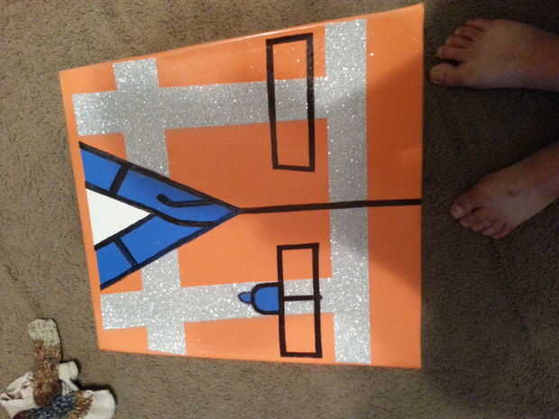 El blanco y el azul de la camisa son la pintura de aerosol que grabó fuera y rociado. Las rayas reflexivas son cinta de brillo que encontré en la sección de Artes y oficios de una tienda local. Todo el negro es marcador Sharpie (Asegúrese de obtener un montón de nuevos marcadores porque mierda hacia fuera muy rápidamente aquí) el rojo y el negro en la cara son marcador Sharpie y los dientes blanco fue hecho con pintura en aerosol.