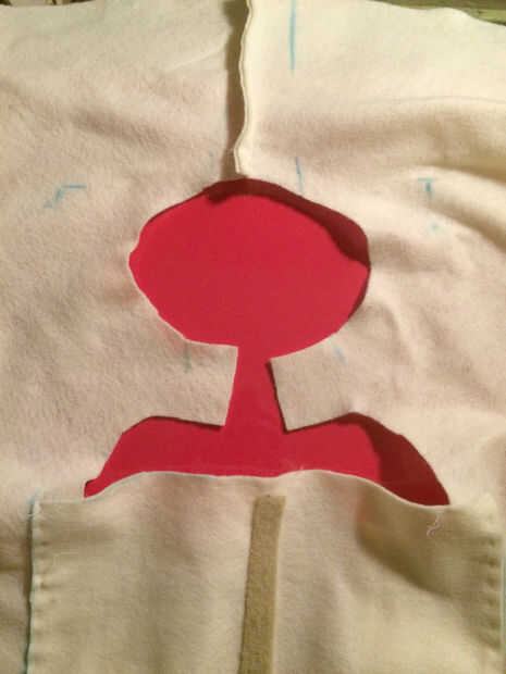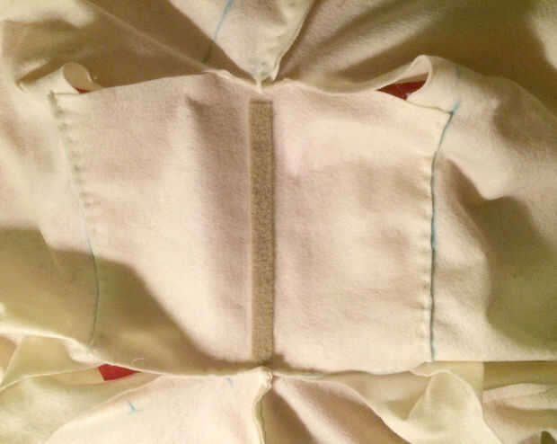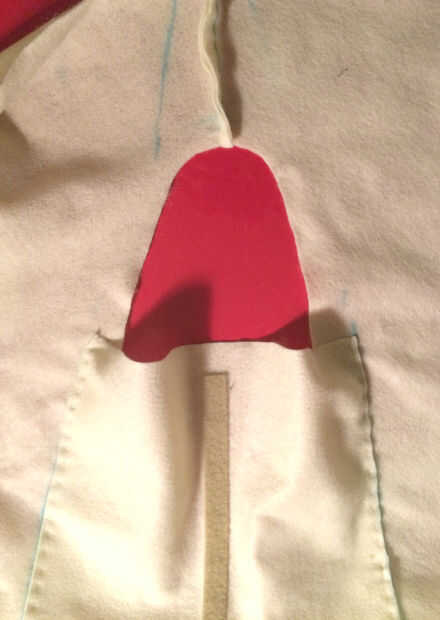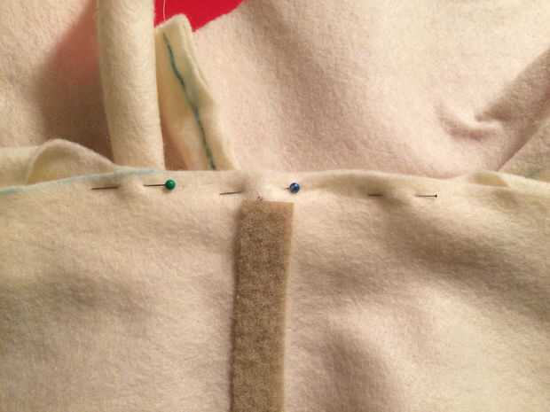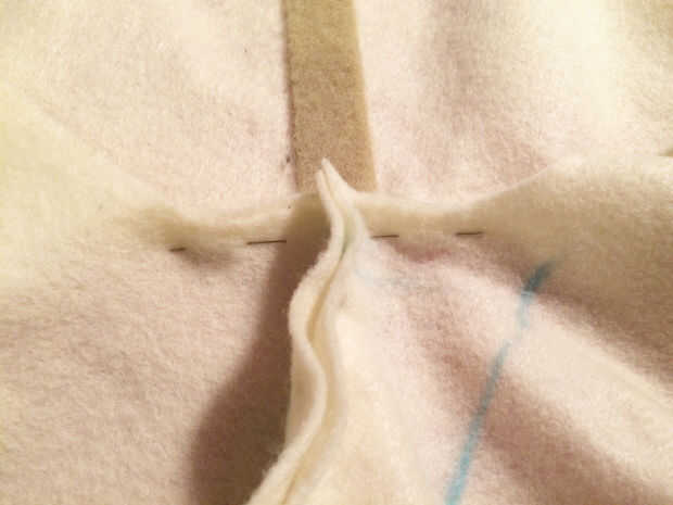 -Encontrar el centro de la longitud del rectángulo y la clavija a la parte superior de la parte superior de la abertura de las patas traseras y la cola, alineando el centro con la costura. Punto 2".