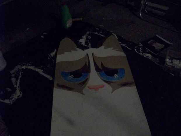 Dibujó en la cara a mano alzada de una foto de gato gruñón de la internet y pintado pulg entonces cosieron laboriosamente. era toda la mano cosida y tomó cerca de 20 horas para juntar todo. El producto final fue pesado superior así que tuve que hacer un refuerzo de piezas de espuma de poliestireno y bambú para apuntalar los. Todo se encuentra a unos 8 pies de altura.