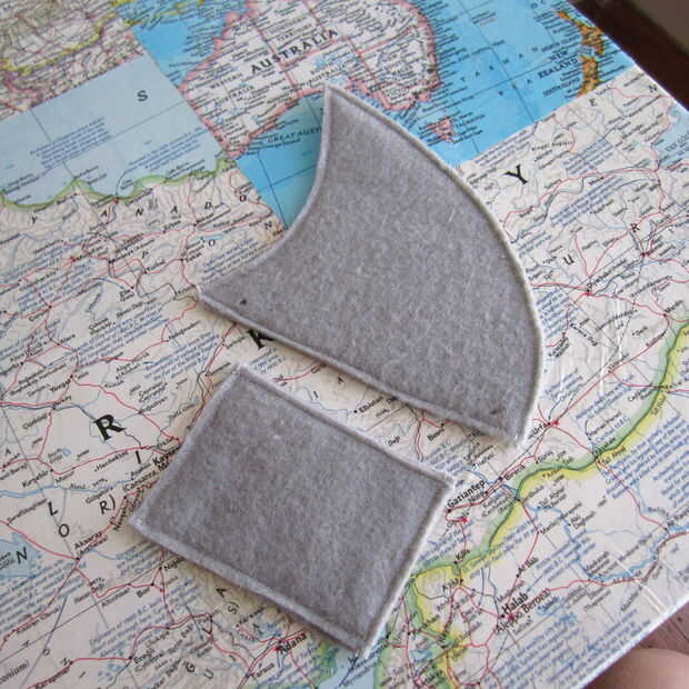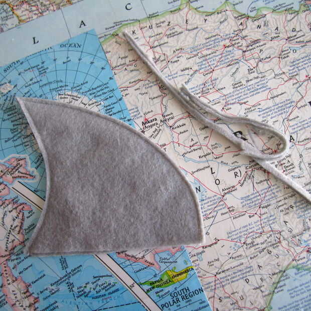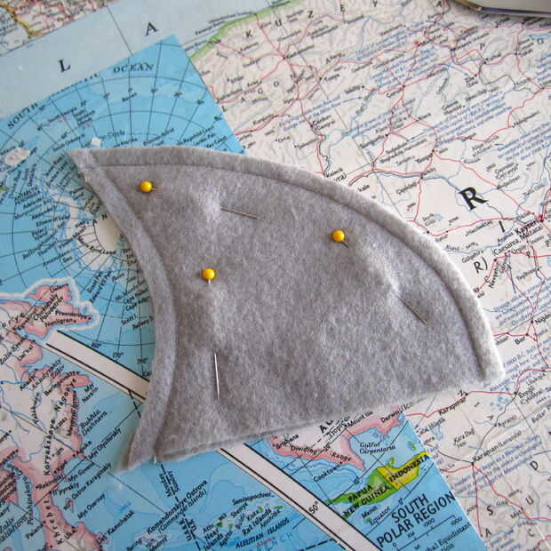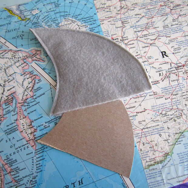 Había ajustado el margen de costura por lo que parecía más limpio, también. Entonces yo cortar un pedazo de cartulina de la caja de cereal al ser ligeramente más pequeña que la aleta de fieltro por lo que encajaría muy bien en el interior. Puede que necesite recortar un poco la parte inferior de la pieza de cartulina para conseguir que encajan. Una vez que el cartón está dentro de la aleta, coser sobre la parte inferior para sellar todo en su lugar.