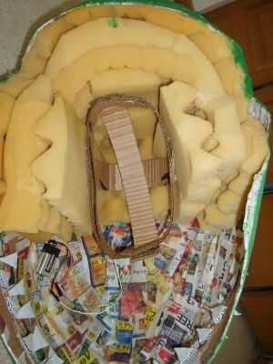Los ojos se forman a partir de formas plásticas de color blanco lechoso reciclado halloween empaquetado. Algo brillante, reflectante, lo suficientemente delgados como para cortar, translúcido y roundish. Puesto que era aplastante, pongo abrigo de saran arrugado dentro para darle fuerza. He creado dos ojos LED amarillos ojos utilizando un circuito de 9v. Les tengo grueso en su lugar de trabajo bajo la espuma y bajo el abrigo de saran en los ojos. La batería de 9v simplemente mete debajo de la espuma así y no se pega por lo que resultó un apagado.