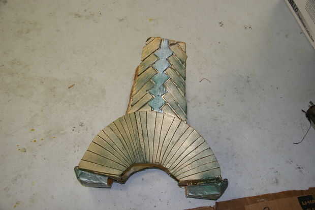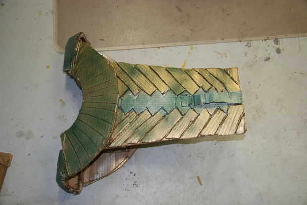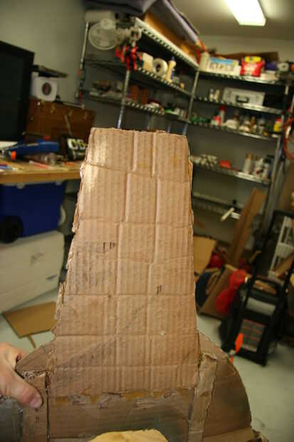 pegamento el trapezoide más pequeños frente a la mayor parte frontal del torso superior circular protector y pegue el trapezoide detrás más grande en el lado más pequeño detrás del torso superior circular protector del frente y parte posterior se ve en fotos 1 y 8, el frente 1 y la parte posterior siendo 8.