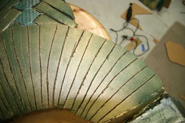 cortar 2 formas semicirculares que coinciden con la mitad de lo circular y pegar en él que las formas semicirculares son vistas en el cuadro 6. luego use el cuchillo o la dremel para cortar las líneas en la segunda capa. como en la imagen 7