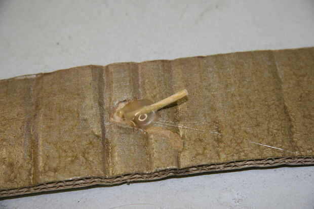 el último paso de la correa es el gancho. Esta es la parte más importante de la correa porque cambia la correa de un pedazo de cartón a un cinturón real. para hacer el gancho toma algo redondo y madera, usé un pincho de bambú y pegar a través de la cartulina en ángulo para que la goma elástica no puede salir. como en la imagen 5. utilizar porciones de pegamento caliente en ambos lados como en los cuadros 5 y 6