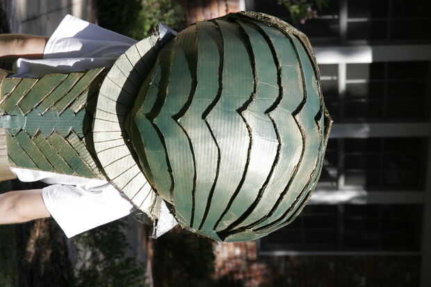 ahora corte un montón de tiras largas con puntos de curva en medio. uno de ellos se muestra en la figura 2 después de que a partir de la parte inferior de la parte afuera de la volante como cerca de la parte inferior del casco como usted puede conseguir. empezarles pegado en un manera curvada, subiendo hasta la parte posterior. Esto le llevará un tiempo ya que hay un montón de estas pizarras posteriores. Asegúrese de que curva hacia arriba para cubrir la parte superior de la cabeza.