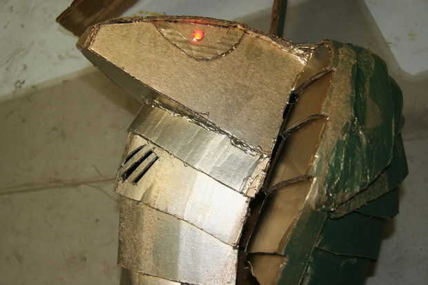 antes de comenzar, pegue un pedazo plano grande en la parte posterior de la cabeza que va hasta la parte inferior de la pieza de cuello. entonces nivelar los lados con varias piezas de cartón. la espalda debe quedar plana.