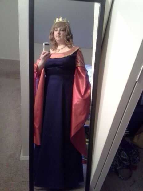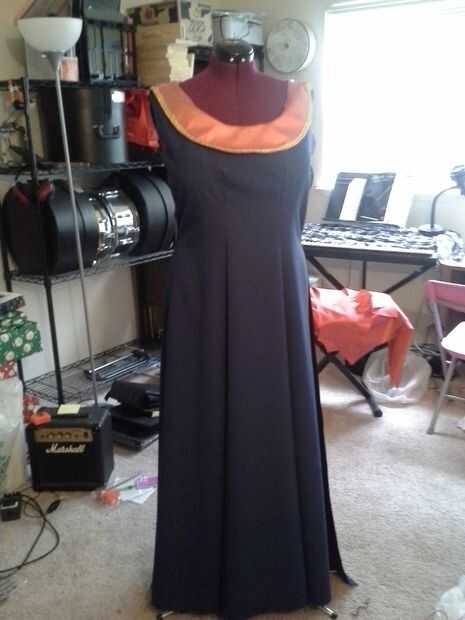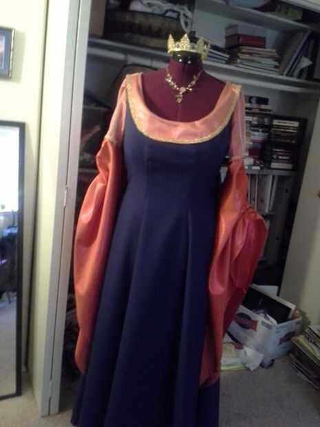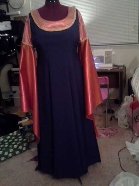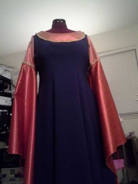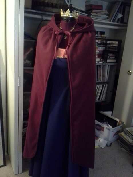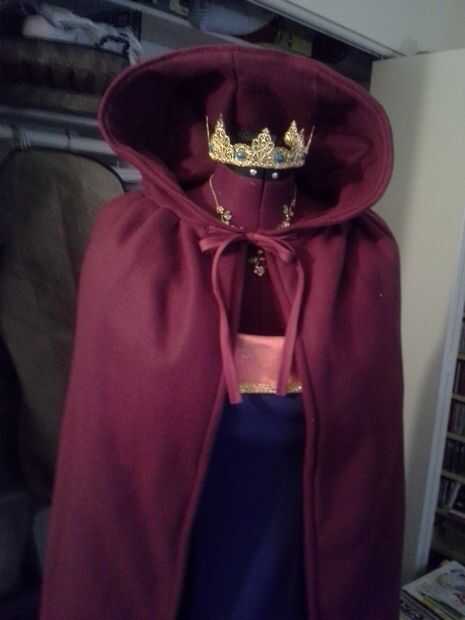 Para materiales, usé satisfaciendo clásico para el cuerpo del vestido, de seda para las mangas, malla oro para el cuello y parte superior de las mangas, oro para los detalles decorativos alrededor del cuello y mangas, emparejando el Cording de mangas (son ajustables)! y 5yds del paño grueso y suave para el cabo (ya había alineado el cabo de lana para el calor adicional). Para la corona, utiliza granos de oro, oro había plateado alambre y vintage abalorios azul plástico.