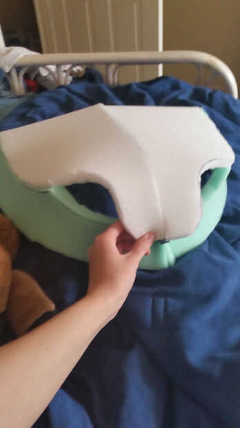 - Pegamento caliente la tela plana a tu espuma alrededor de los bordes. Una vez más, el pegamento caliente deshace la espuma y cambiará la forma de su producto final. La línea en el centro de la cabeza (como se ve en la foto) fue creada con pegamento caliente y manteniendo el guión hasta que se enfríe. El mismo proceso fue utilizado para las "cejas".