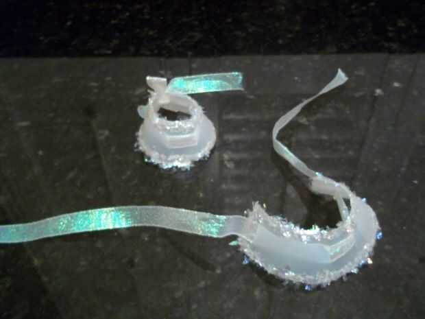 Las pulseras y tobilleras están hechos de la parte superior de la jarra de leche. Brillo y las aberturas cortan en el plástico de la cinta a través del hilo de rosca.