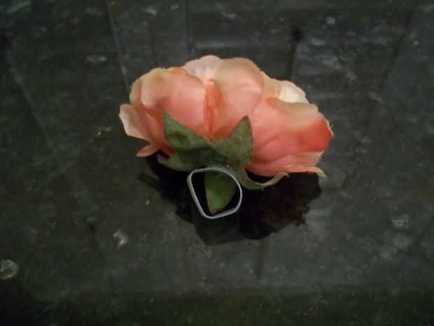 El anillo se hace de la manija de la jarra de leche. Simplemente corte una pieza pequeña y pegamento caliente una flor en la parte superior.