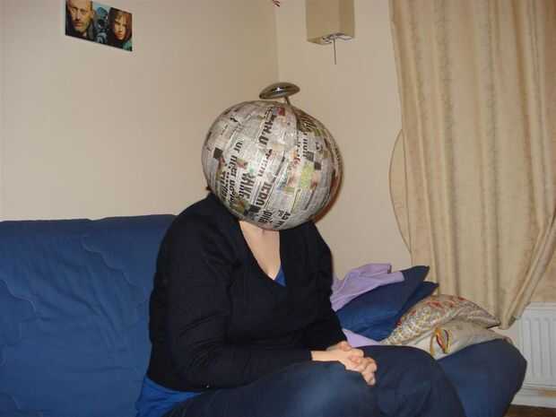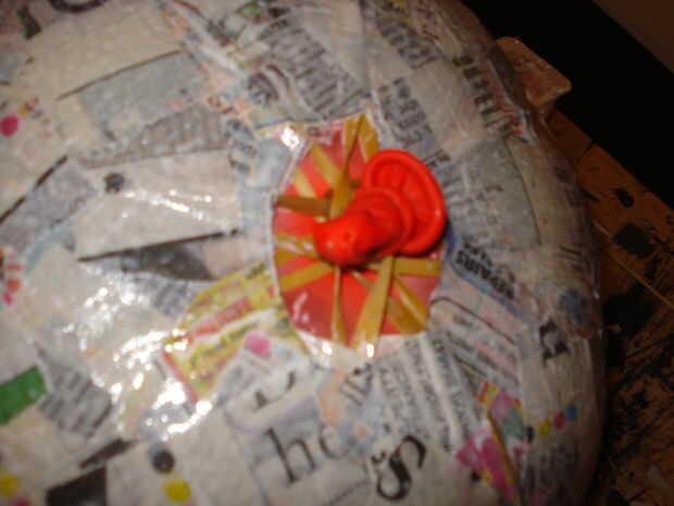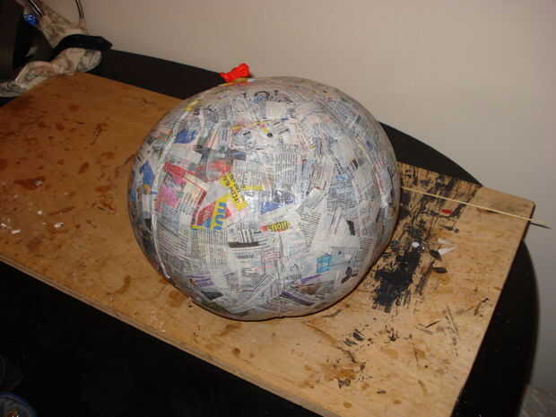 Una vez seco desinflar el balón y retire del papel maché. Corte algunos el exceso alrededor de la base para que finalmente pueda obtener su cabeza en el globo. Usé este exceso para cubrir el agujero en la parte superior del balón, de esta manera que usted sólo tiene que añadir dos capas de papel maché (uno dentro y un exterior) para dar la combinación del mismo grosor que el resto del globo.