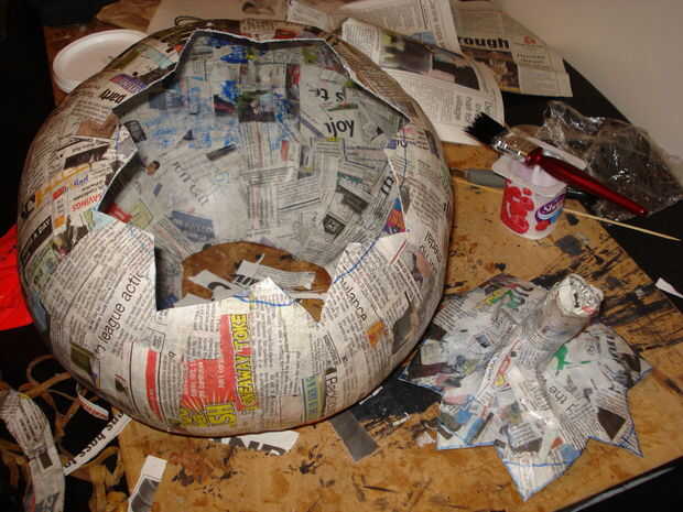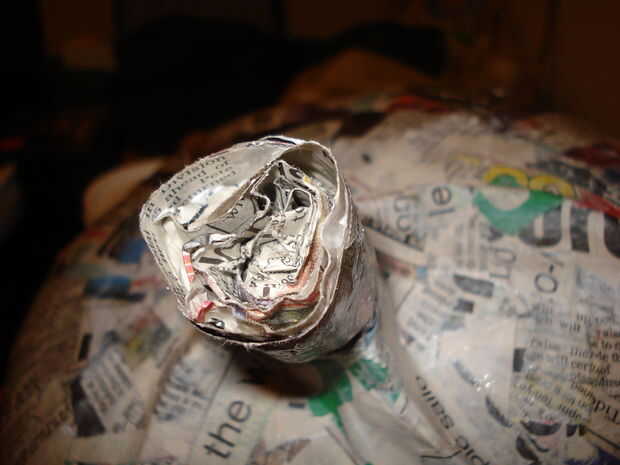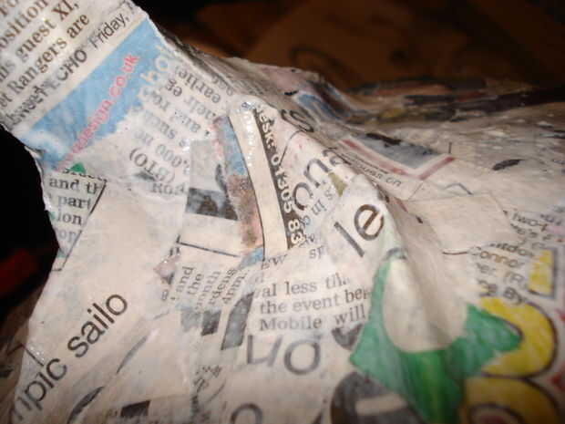 El tallo es sólo un rollo de periódico arrugado. Arrugó el papel para que todo el asunto más textura. Una cucharada grande de pegamento lo aferra a la calabaza. El tallo de una calabaza cirios en la carne, he creado estos detalles con el periódico doblado en los cantos y luego redondeados con periódico más. Crea las formas como se ve en las fotos.