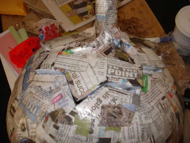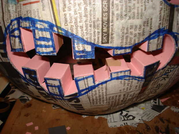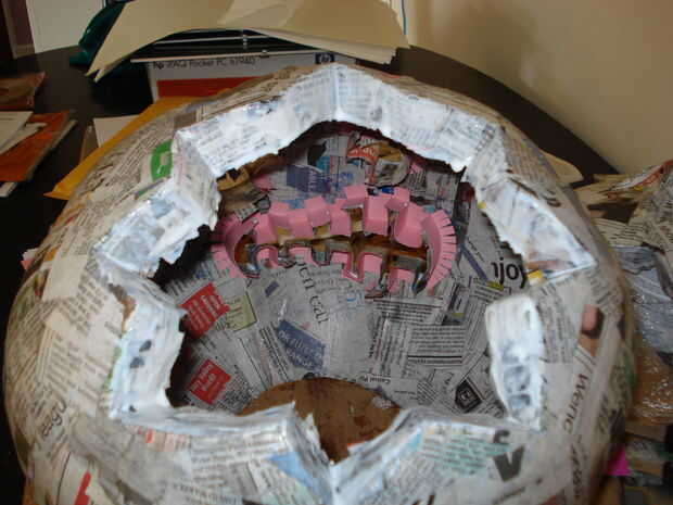 Una vez que estés feliz con el cartón le da otra cubierta de papel maché, esto mezclará las piezas nuevas con el resto de la cáscara de la calabaza. Pegamento una vez seco la tapa calabaza volver a colocar en la cáscara de calabaza. Las dos partes deben estar alineados correctamente ya no lucirá la tapa como se ha extraído la cáscara y reemplazado.
