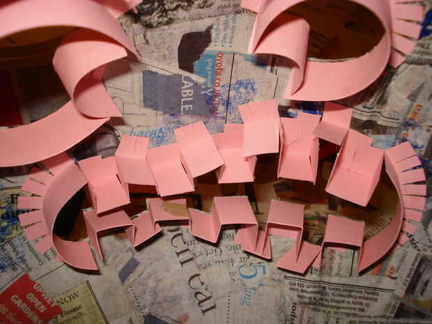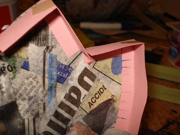 Una vez talladas las paredes de una calabaza suelen ser sobre un espesor de dos centímetros. Para crear la ilusión de espesor tomé algunas tarjeta fina y había atado le alrededor de los cortes. Iniciar con la tapa de la calabaza ya que es un pedazo pequeño manejable sobre todo líneas rectas. Flecos en la tarjeta permiten ser curvado alrededor de formas y hacer que ajuste mejor a la calabaza.