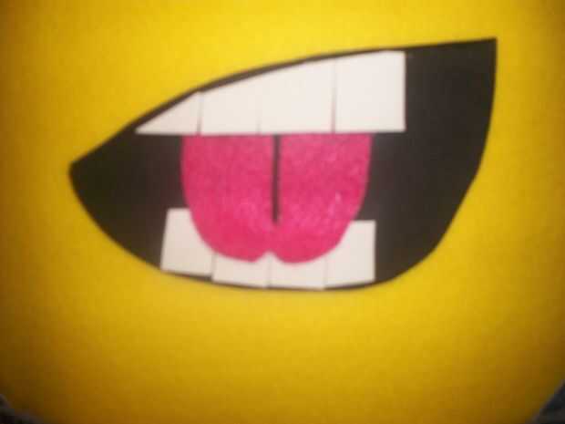 El ojo era un buen lugar para mi hijo de 10 años ver de. Solía mi Cricut para cortar el círculo, pero usted puede comprar estos precortadas. Puedes probar con la mano pero nunca parece incluso. I utilizar espuma blanca para el ojo y luego pegar a una tela escarpada negra en la parte posterior. Asegúrese de que el blanco más grande y el agujero del ojo precortado en el cuerpo. Esto cubre cualquier imperfección también. También utilicé la espuma para los anteojos con una correa de tela negra. La boca es de espuma negra con dientes de espuma blanca. Corte la lengüeta de fieltro y pegado una astilla fina de negro en el centro.