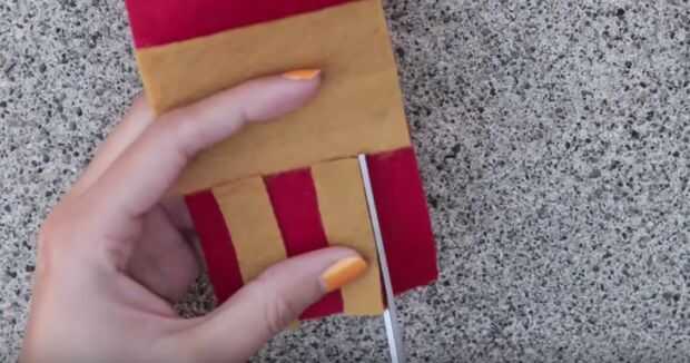 Fino, corto, tiras de fieltro oro y pegarlos verticalmente en el extremo de la bufanda. Luego, cortar a lo largo de los bordes de las tiras a franja de forma.
