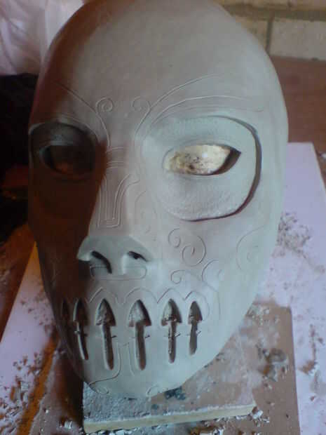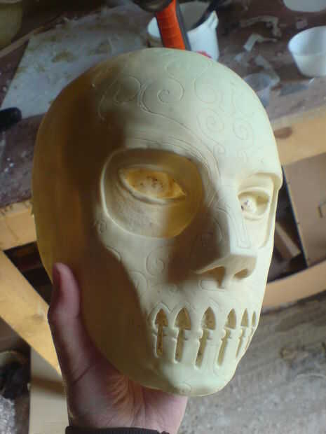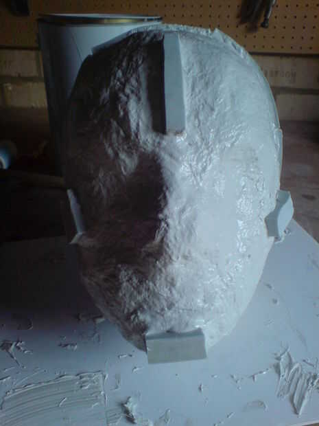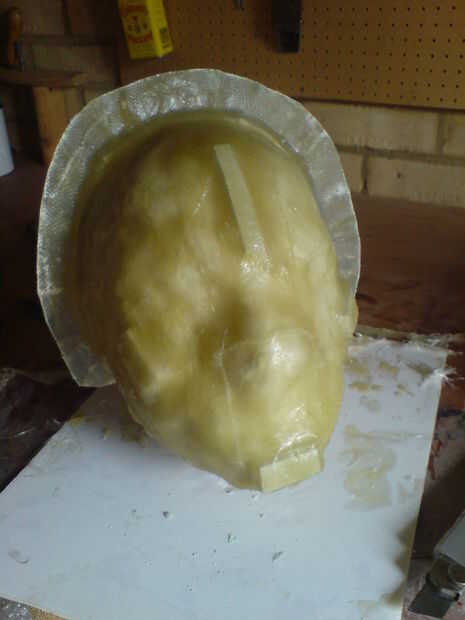 Una vez que seca, el molde entero fue quitado de la escultura y se limpian. Luego una mascarilla de resina rápida fundido en el molde del molde y este elenco fina con respaldo coupel de capas de fibra de vidrio. A continuación, recortar los bordes y cortar los ojos y la boca de los agujeros utilizando una herramienta giratoria.
