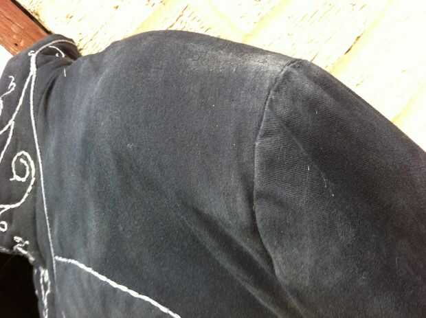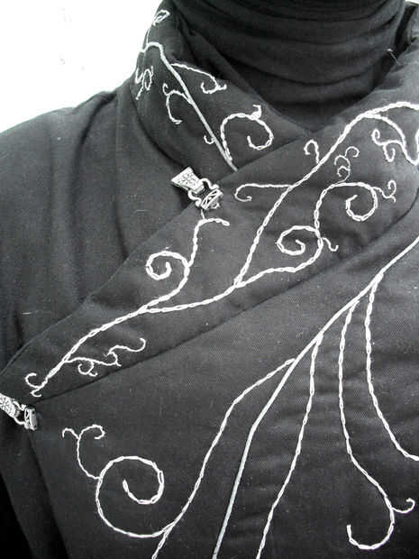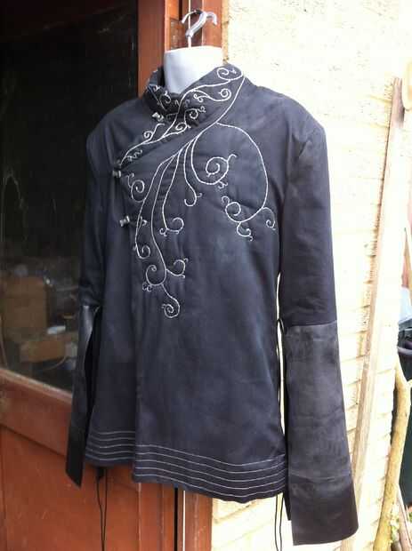 Es una buena calidad, de la tela cruzada pesada, con un básico negro forro y piel artificial bajo mangas. Realmente ayuda hacer el bordado destacan, hay una capa de guata en la parte frontal de la túnica y el collar. También están equipadas para dar forma y un botón escondido en el interior para sujetar la tapa frontal en lugar de hombreras.