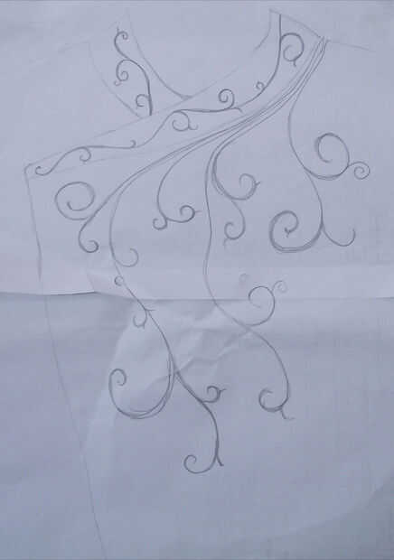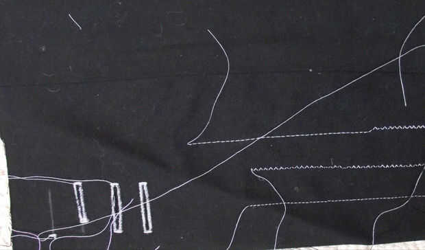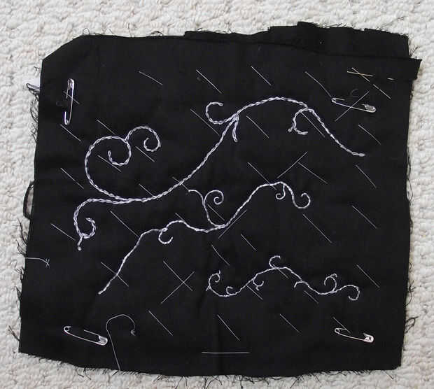 Una vez completa la maqueta, el siguiente paso fue hacer unas pruebas de bordado. Se utilizaron tres técnicas diferentes, la principal es una puntada de cadena, el más pequeño es un pespuntes y "couching" es el más gruesos remolinos gris (costura algún cable o tubería sobre la tela con hilo de algodón fino). Una vez que estaba decidido, la próxima etapa era hacer la última túnica.