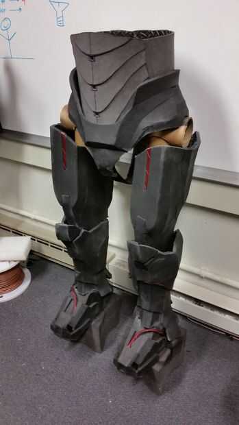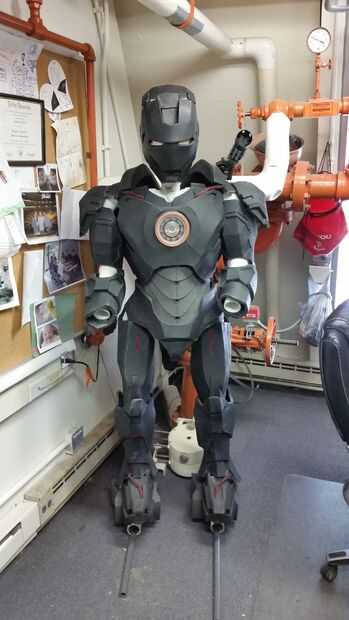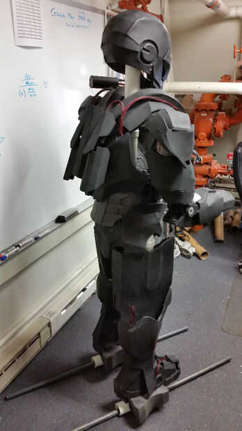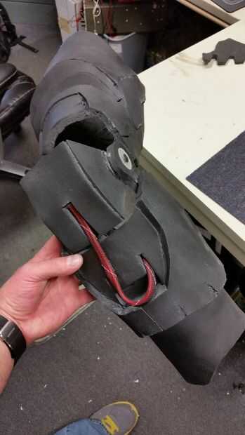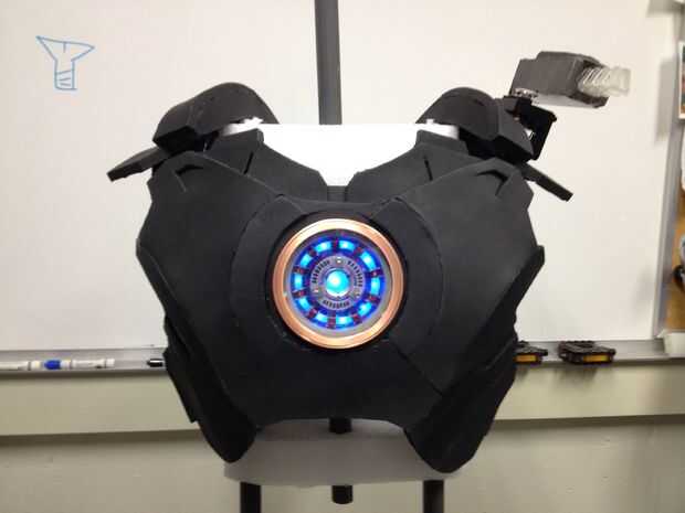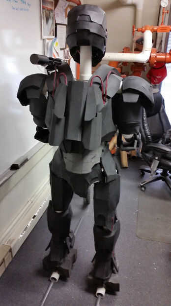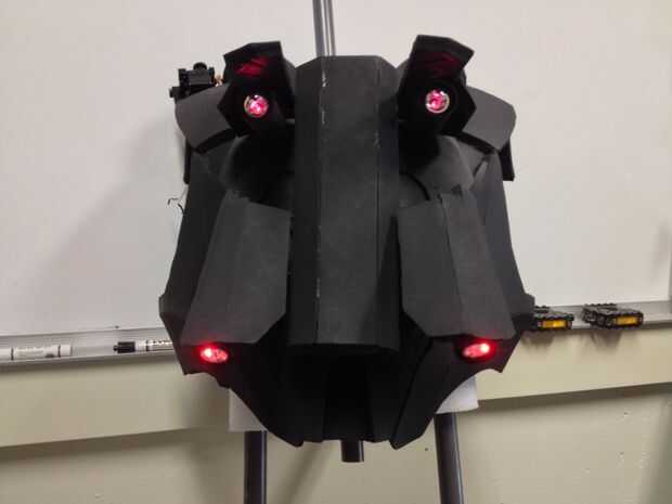 Las partes del pecho fueron Unidas con velcro y correas. Todos los leds y servos electrónicos fueron alimentado por unas baterías de 9v.