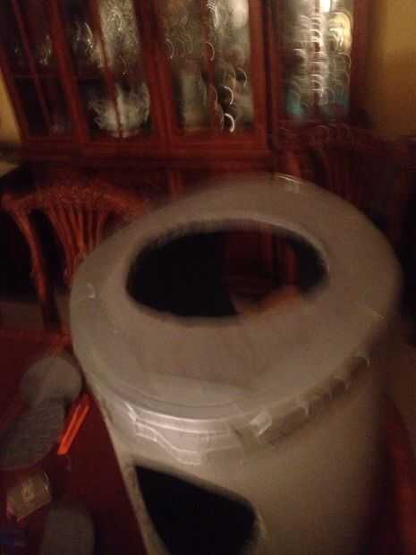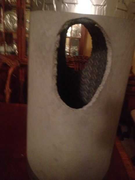 Obviamente necesitaba un lugar para pegar mis brazos hacia fuera, así que medir y cortar dos agujeros más grandes que mis brazos a cada lado. También corté un pedazo de una plaza de estera de espuma diferentes para poner en la parte superior y cortar un agujero para la cabeza antes de grabar ese pedazo en la parte superior del cilindro.