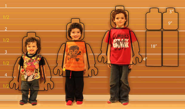 Puse tres líneas de tiza en una pared, separados por 1 pie cada línea. Pongo el frente de los muchachos de la pared, uno por uno y tomó la foto. Luego retocado ellos juntos y con otra foto de Lego Guy, luego compararon con las proporciones de Lego Guy. He utilizado las líneas de la pared para averiguar las medidas del traje final demasiado.
