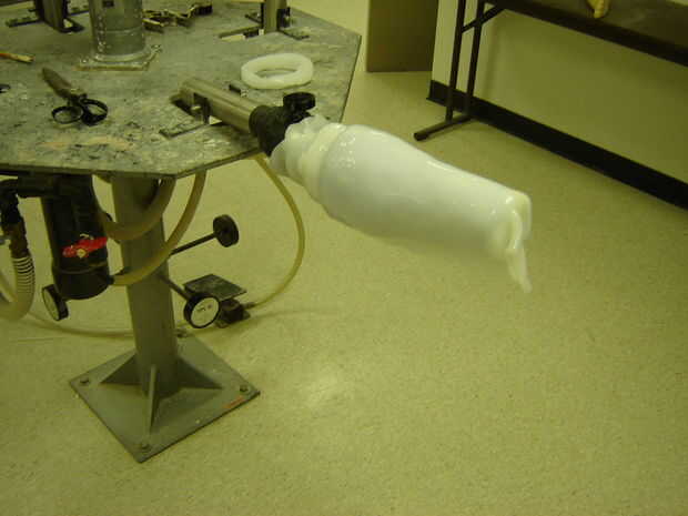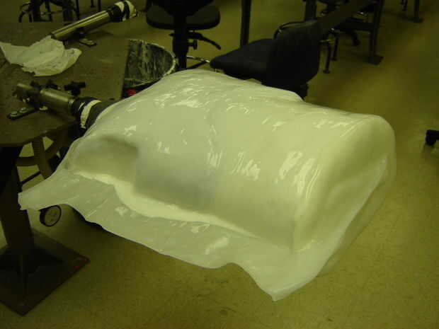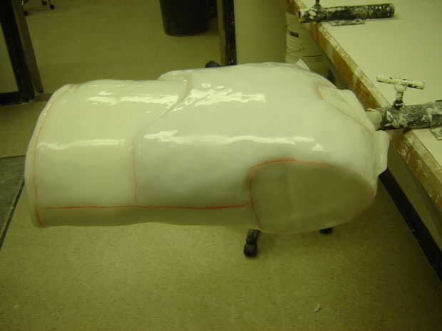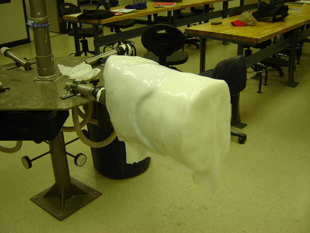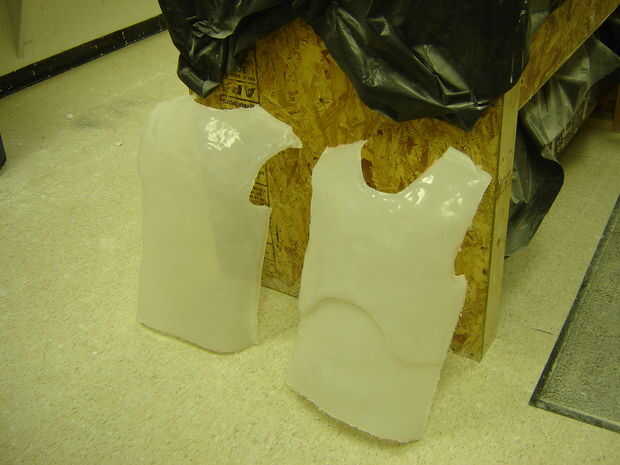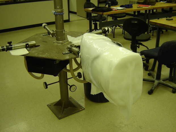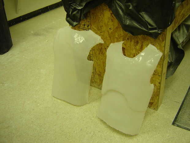 El siguiente paso fue al plástico de la forma con la aspiradora sobre los modelos de yeso modificado. Aquí utilicé plástico de polietileno de 3/16 de pulgada de grado médico. Calienta el plástico en el horno hasta que fue flexible y débil, entonces cubierto sobre cada modelo, conectando en cada extremo, entonces dado vuelta en el vacío para hacer el plástico se ajustan al modelo. Como el plástico se enfría, se endureció y tomó la forma de cada modelo.