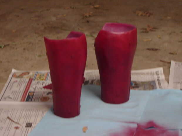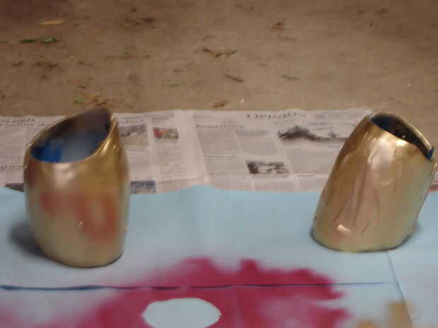 Hice estos trajes con baldes de helado para los cascos, cajas de papel de oficina como placas de tórax, cartón y núcleo de espuma para detallar y bateria powered luces para la seguridad del efecto y la noche. Usé las latas de aerosol para el color ba