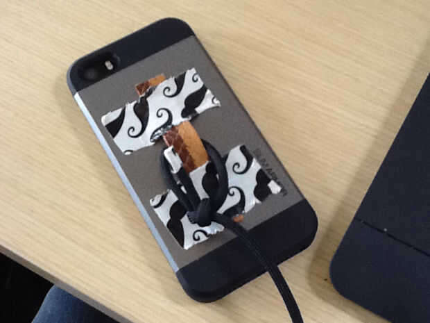 2) aprendí con el traje de Twitter que mi teléfono sea absolutamente con frecuencia dentro y fuera de mi bolsillo. Tenía que encontrar una manera de garantizar mi teléfono a mi persona y a veces, la más rápida y más sencilla (aunque algo poco elegante) solución funciona mejor - simplemente de conducto grabado un trozo pequeño correa sobrante al caso de mi teléfono. Gancho agarrador que algunos paracord - a 5'11 ", 2.5' mantendrá atado a mí sin restringir demasiado y no chocar con el suelo cuando inevitablemente soltarlo. Pasarlo a través de la correa y empate con un doble enganche medio o nudo cuadrado o lo que sea seguro nudo lo sabe en un extremo, el otro extremo en un bucle de cinturón sobre los pantalones. El residuo pegajoso debe salir muy fácilmente después de que sus travesuras han llegado a su fin.