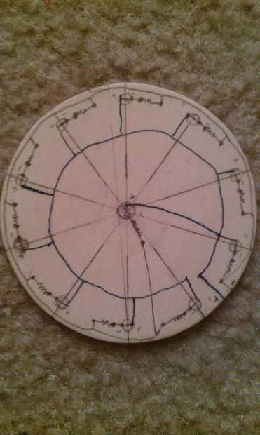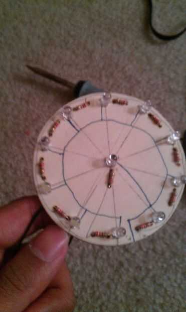 1. encontrar el centro del círculo con un lápiz y una regla. Trate de ser preciso. Entonces utilice el transportador para marcar fuera de las líneas a intervalos de 18 grados va hacia fuera desde el centro. Esto le ayuda a colocar los LEDs. Dibujar en los terminales del LED cerca del borde del disco, luego dibujar en las terminales de la resistencia a cada LED, para que cada LED tiene un terminal conectado a una resistencia.