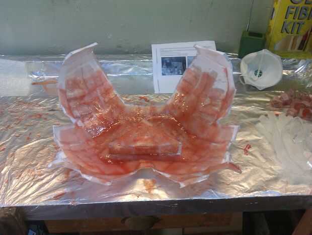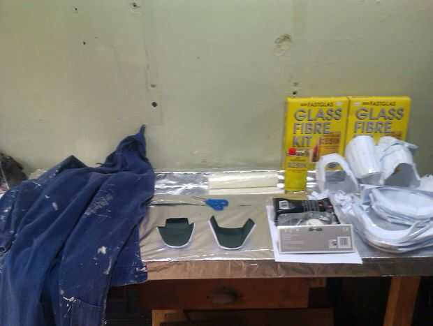Cortar toda la fibra de vidrio mate en grandes y pequeñas, medianas y extraña forma. no se sabe cuánto usted lo necesita todo. Este corte con tijeras y guantes. puesto en la general y gafas así como su respirador y comenzar a mezclar la resina con su endurecedor. diferentes marcas tienen diferentes requerimientos en relación así leer la caja para comprobar. usé aproximadamente 1; 5. capa del interior de la pieza con resina y cubierta con fibra de vidrio, después de esto agrega otra capa de resina. Dependiendo del tamaño la parte que necesite otra capa de fibra de vidrio otros sabios será demasiado débil. justo lo mismo que arriba en la parte superior. después todas las capas de pintura un poco sólida y en el exterior de la pieza con resina, solamente resina.