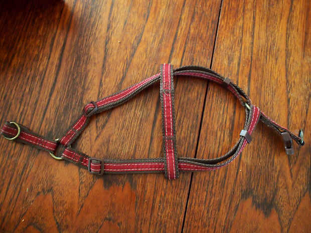 Tengo un arnés de cuerpo para mi perro, correas alrededor de ambas piernas y su pecho con un clip de conexión en la parte posterior.