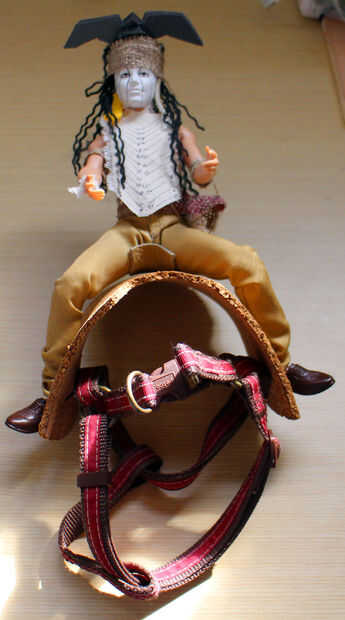 Donde los estribos estaría en una silla de montar regular son los puntos de accesorio para mi silla de montar. Con la muñeca en la silla de montar hace dos pequeños orificios a ambos lados de los tobillos de la muñeca, luego alimentado alambre bendable cosa a través de la conexión.