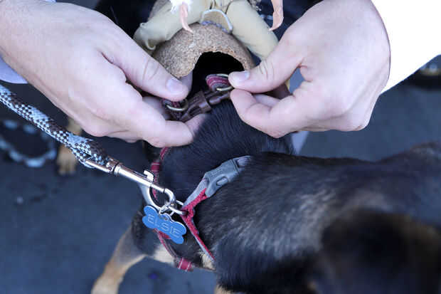 Agregado cuidadosamente el arnés/silla de montar a su compañero canino. Su perro puede ser un poco más cooperativo con algunas golosinas en mano.