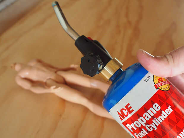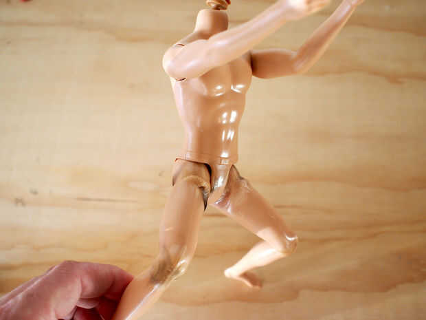 Usando un soplete de propano a muy baja temperatura, agitó cuidadosamente la articulación fuego para ablandar el plástico. Asegurándose de mantener la muñeca en movimiento prevenir el encendido, cuando el plástico se suavizó la pierna estaba doblado al ángulo apropiado. Este proceso se repite para ambas rodillas y a ambos lados de las caderas.