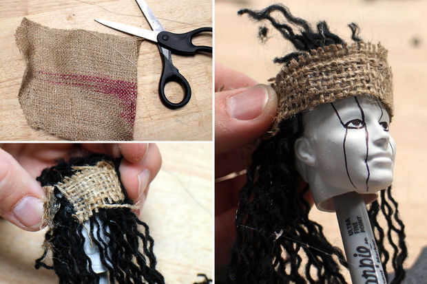 El abrigo principal fue hecho de un delgado trozo de arpillera, doblado por la mitad longitudinalmente. Este headbad fue pegado a la cabeza con pegamento caliente más, sobre el cabello.