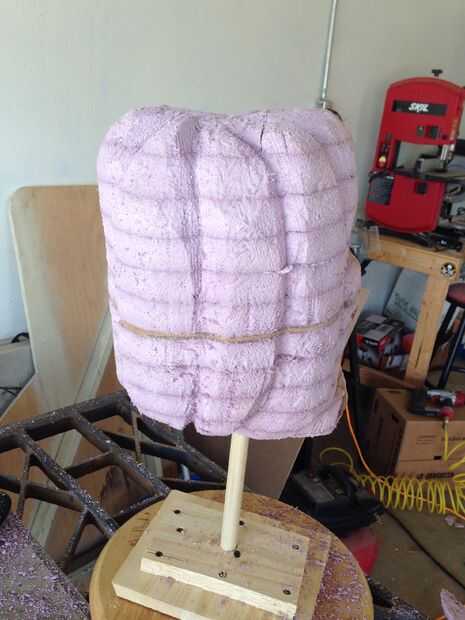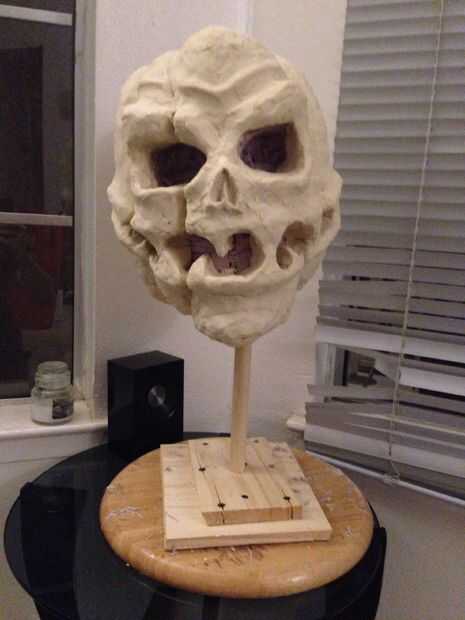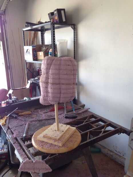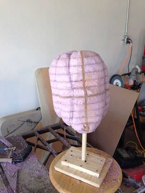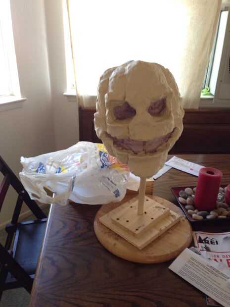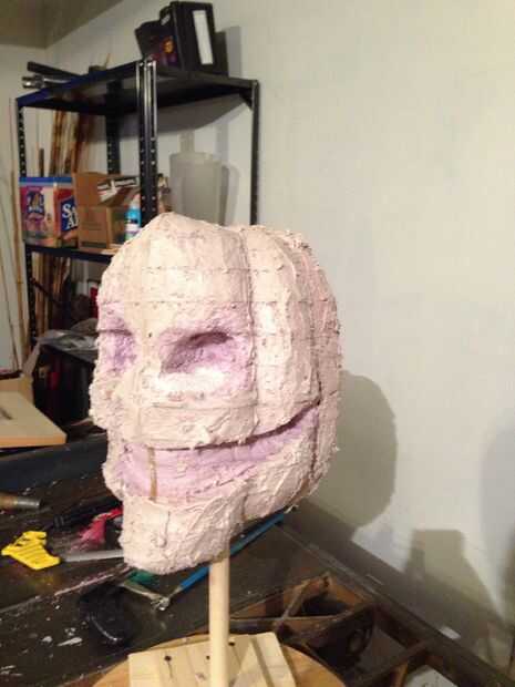 Comencé por mi cabeza de medición, corte una sección de madera en dos direcciones y luego había pegado aislamiento rosada espuma en las esquinas. Desde aquí había tallado una forma muy básica de una calabaza alargada. Lentamente comencé dándole faciales características, como una barbilla, frente, que he añadido un zócalos de área y ojo de boca.