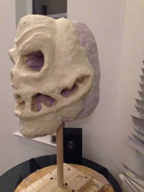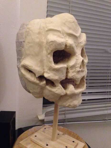 He añadido algunas capas de bondo para endurecer la espuma. Luego tomó arcilla (azufre) y comenzaron a construir las zonas de la cara utilizando sobre todo los dedos para obtener la forma básica en su lugar.